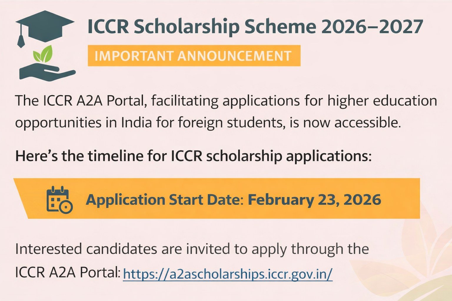 Applications will be accepted online starting 23 February 2026 through the ICCR A2A Scholarship Portal: https://a2ascholarships.iccr.