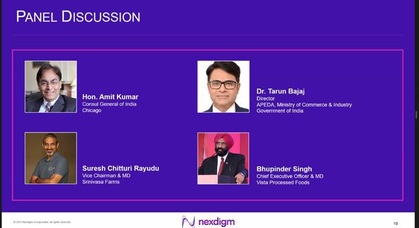 The Consulate General of India, Chicago in partnership with Nexdigm, organized a webinar titled “India’s Attractiveness and Opportunities–Food Processing Industry” today. The event saw participation of over one hundred attendees.
